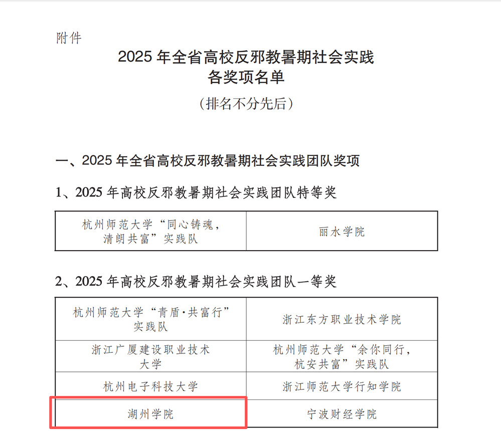 近日,由浙江省高等教育学会思想政治教育分会、浙江省学生联合会、浙江省反邪教协会共同主办的2025年浙江省高校反邪教暑期社会实践现场评审会议在杭州市举行。我院“浙水涤邪跟党走,湖山先锋扬正气”实践团荣获一等奖。