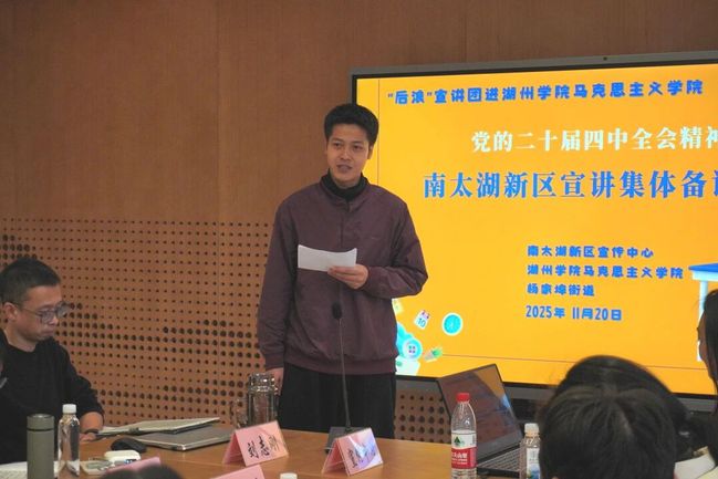 活动现场,马克思主义学院专任教师刘志刚作专题辅导。刘志刚结合鲜活案例与详实数据,系统解读全会核心要义、精神实质及实践要求,帮助宣讲员理清理论脉络、深化理解。南太湖新区文化特派员刘海洲分享实践体悟,提出基层宣讲需扎根群众、立足实践,用通俗语言和喜闻乐见的形式传递全会精神,让理论更具温度与地气。现场还组织观摩浙江省优秀宣讲员示范宣讲视频,为参训人员提供直观学习范本,助力其积累宣讲技巧与实践经验。
