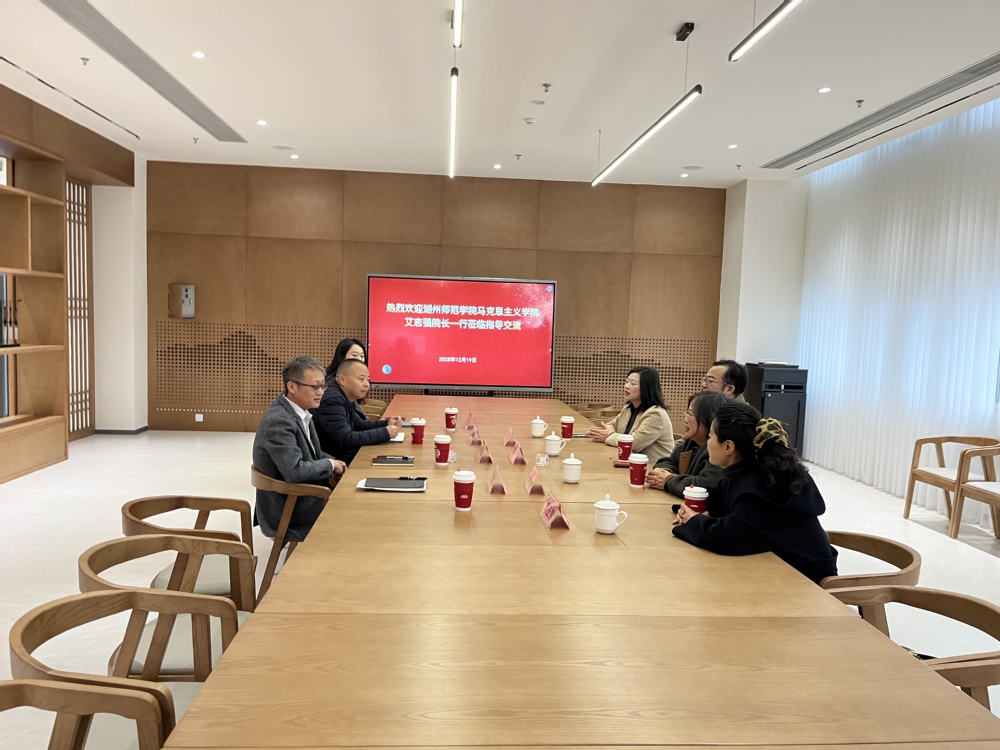 2025年12月19日,湖州师范学院马克思主义学院院长艾志强一行来院调研交流。围绕党的建设、学科发展、师资队伍建设、学生就业及线上阅卷等议题,开展了富有成效的调研交流活动。学院党总支书记、院长尹怀斌带领领导班子成员,以及综合办公室、教学科研办公室相关工作人员热情接待并参加了座谈会。